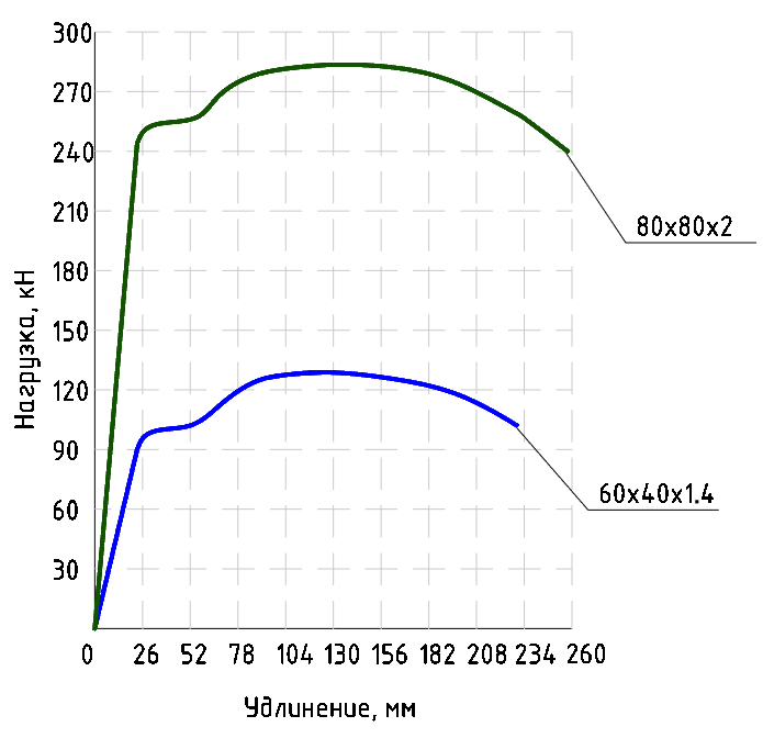 ООО «ПросторГрупп» были проведены испытания столбов на прочность на разрыв. В качестве образцов для испытания были выбраны по 2 столба сечением 60х40х1,4 мм и 80х80х2,0 мм. Длина каждого образца 1000мм. Испытания проводились с помощью машины для испытаний на растяжение с большими усилиями испытания.